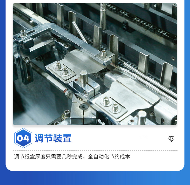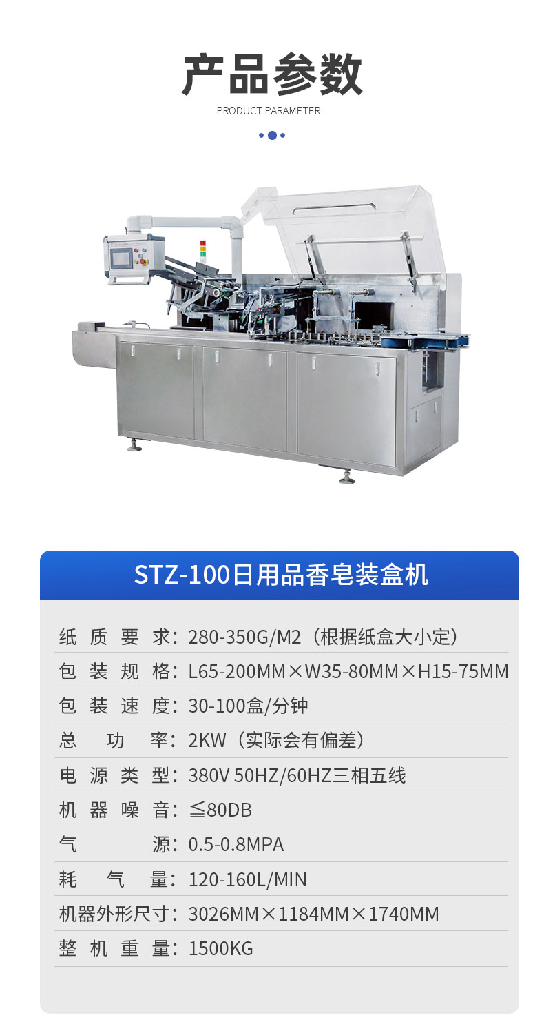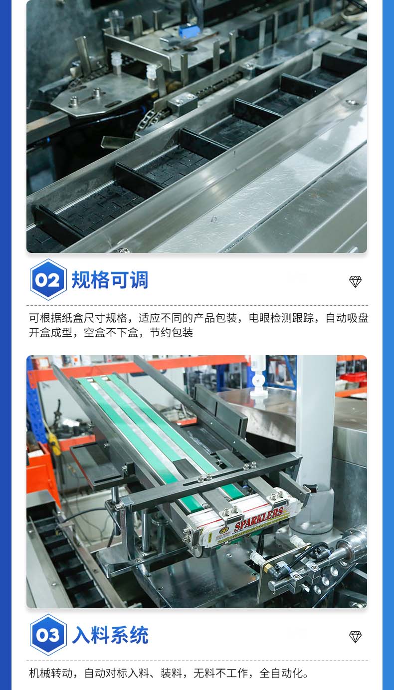 產品概述:機身采用304不銹鋼,干凈整潔,耐腐蝕。前端配置大型物料倉,便于工人拿取。采用自動開(吸)盒,人工擺料,進料,封盒,檢測剔廢等工序,運行平穩(wěn),噪音低。